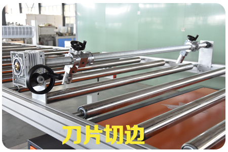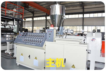 SPC石塑地板生產線,由擠出機、模具、四輥成型機、冷卻系統、牽引機、新一代精加工自動定長切割機、自動成品卸料臺等組成,全自動化控制。SPC石塑地板由擠出機擠出PVC的基材,用四輥壓延機組,分別把PVC彩膜+PVC耐磨層+PVC底膜,一次性壓貼復合而成的產品,工藝簡單、貼合靠熱量完成,不含膠水。在由擠出機擠出,在線實現表面覆膜工藝后,再經過多片鋸分切(因為長度已經固定,只需要縱向多片鋸),然后縱橫向開槽,再表面油漆UV(一般做兩個道)最后包裝入庫。